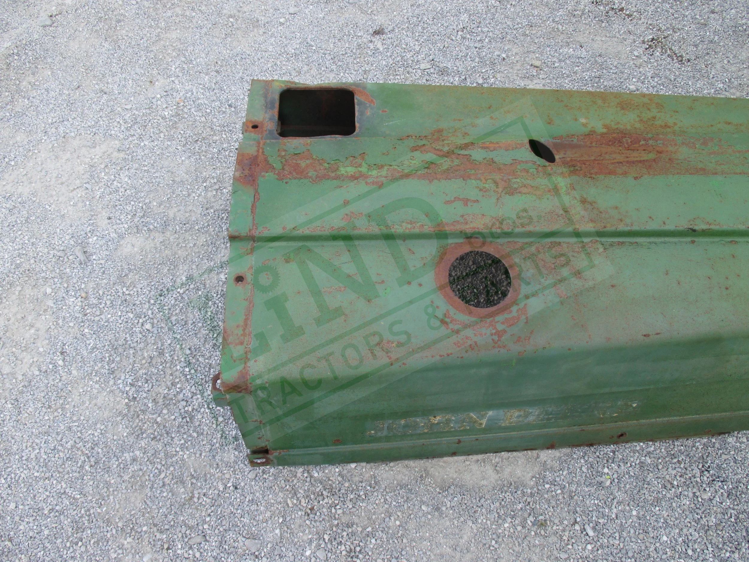 Nice Patina. There is a rust hole on the right hand side, and there is a rust hole and a cut on the right hand side.